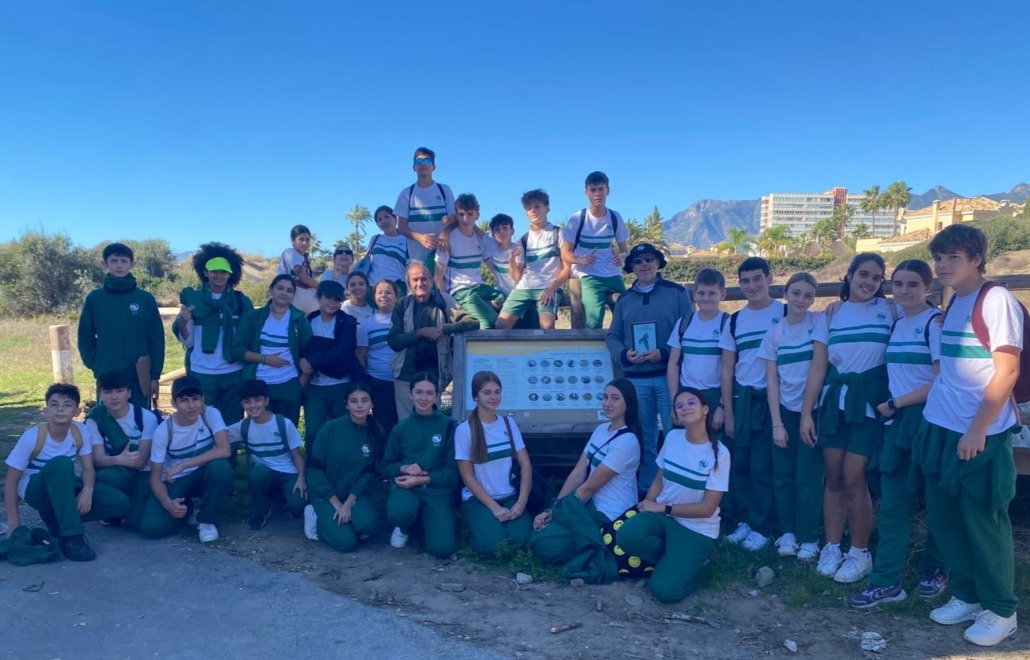 Después del recorrido por la duna, el grupo pudo disfrutar de una auténtica clase magistral sobre aves, su especialidad. Para cerrar la jornada, realizamos la foto tradicional junto al panel que acredita nuestro padrinazgo y recibimos un ejemplar del libro Las aves de Marbella, entregado por un representante de la asociación ProDunas, de la que nuestro guía es coautor.